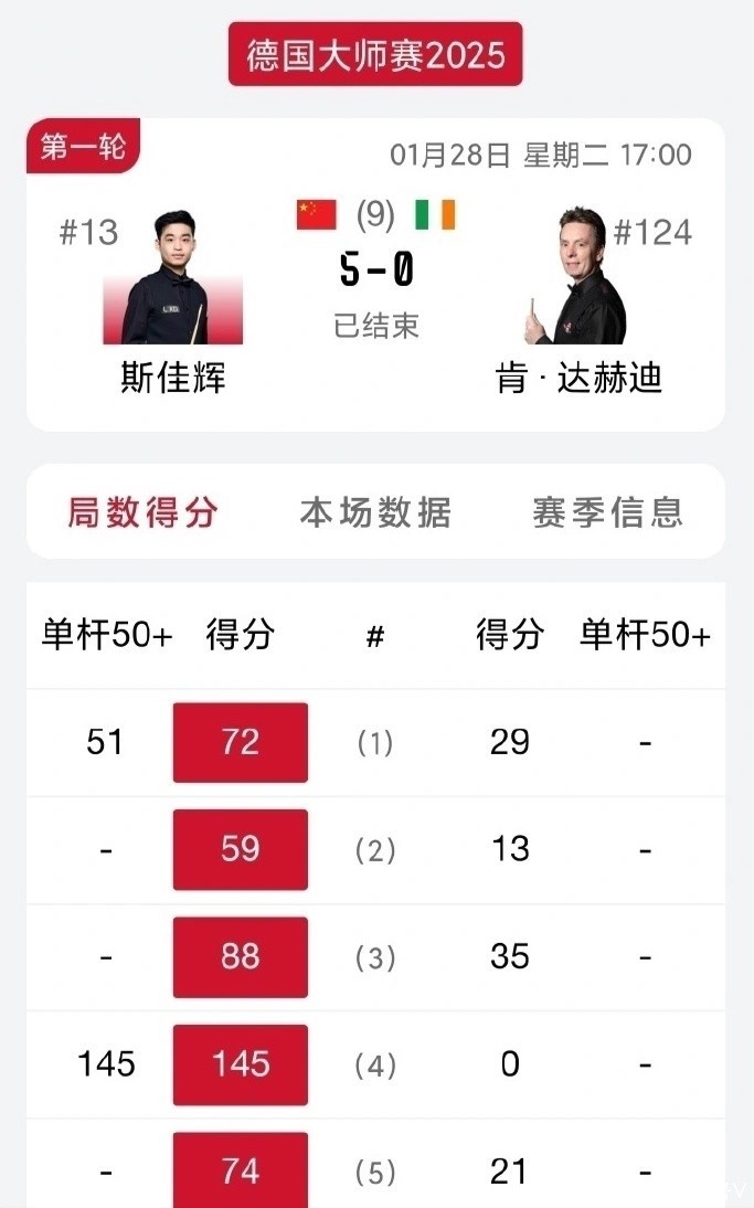 第三局,斯佳辉又通过零敲碎打,以88-35赢下,比分上风扩大到3-0。第四局,斯佳辉打出本场比赛的最好单杆阐扬,他轰出单杆145分,这亦然本次比赛开赛后的单杆最高分,145-0零封敌手,比分上风进一步扩大到4-0,轻易得到4个赛点。